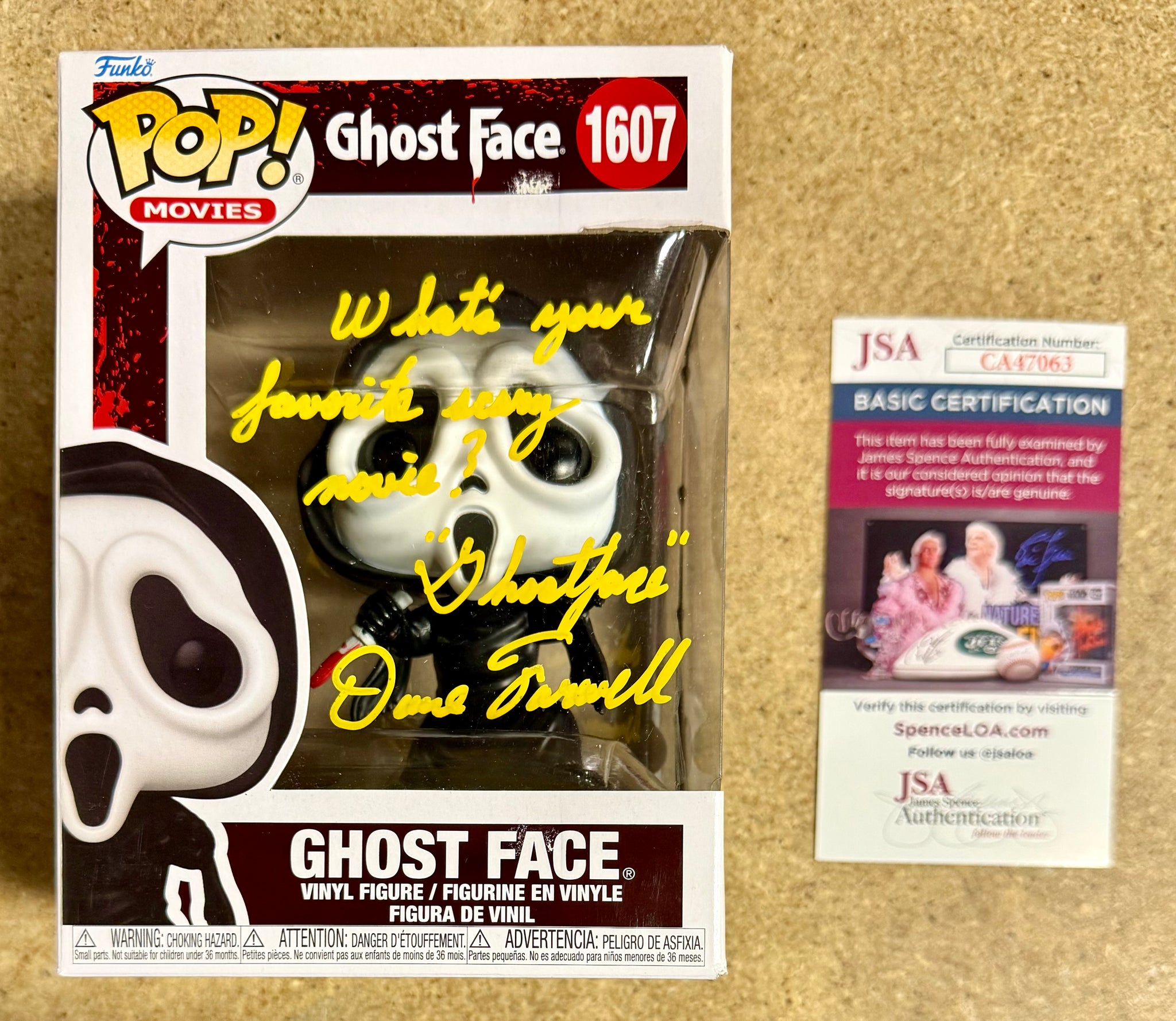 This Funko Pop! vinyl figure features the iconic Ghostface character from the Scream movie franchise, autographed by Dane Farwell and authenticated by James Spence Authentication (JSA). The figure is part of the Pop! product line and is #1607. It comes in its original packaging (unopened) and has a protector.