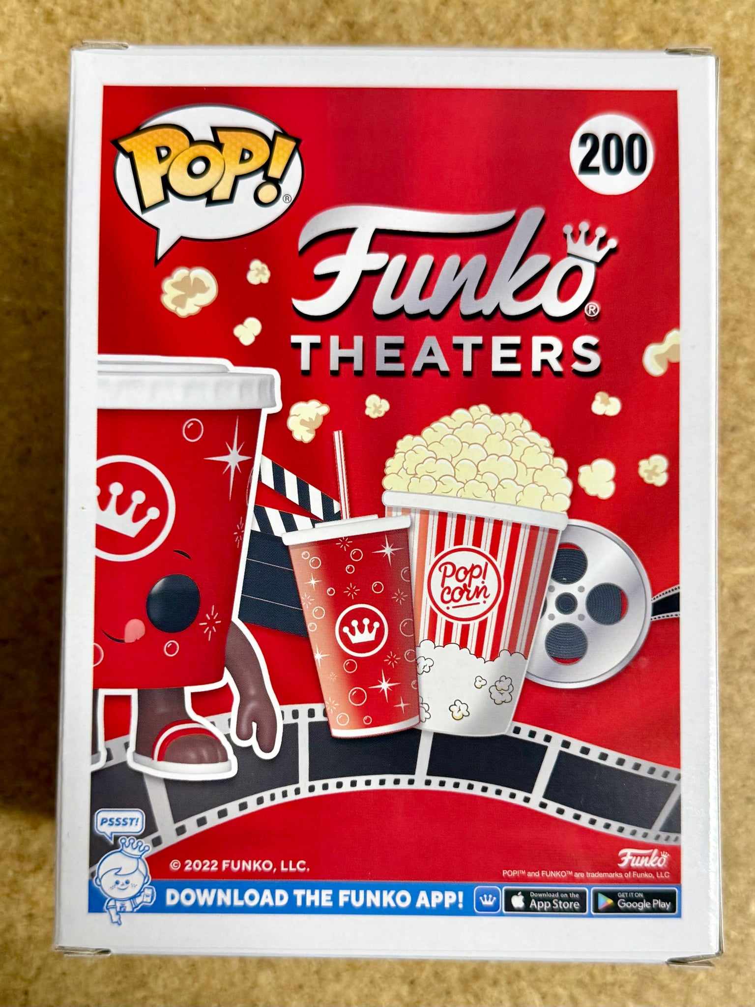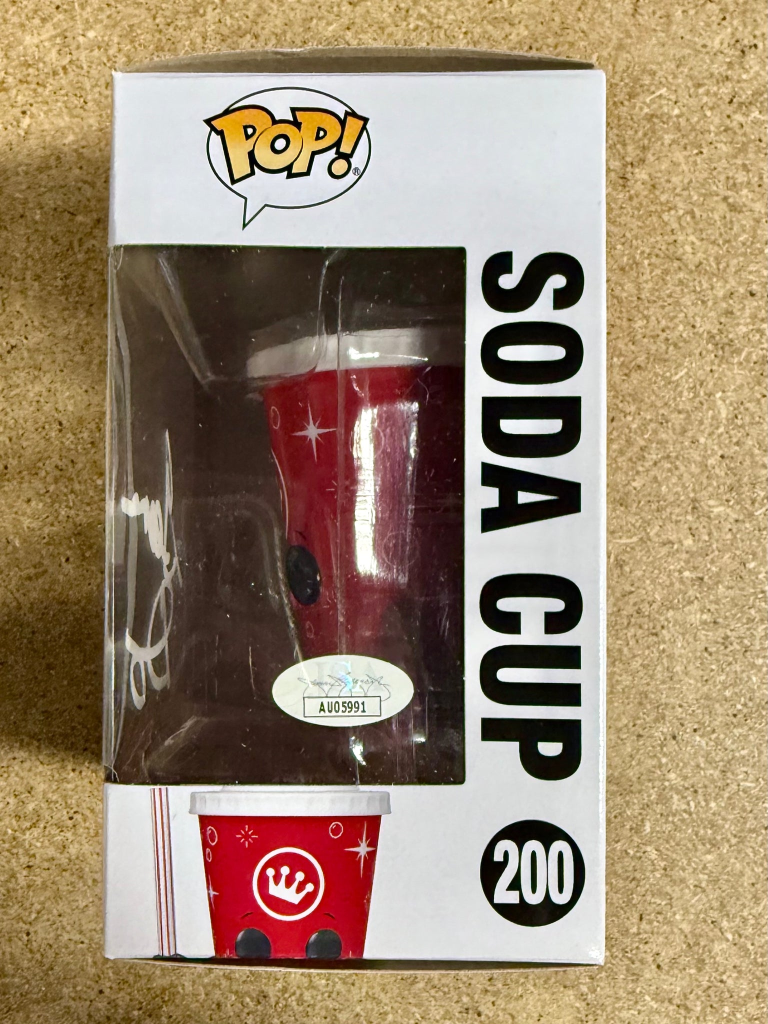 The product is a Geena Davis signed Funko Pop! vinyl figure depicting a movie theaters soda cup. This collectible piece, part of the Pop! collection released in 2019, features an authentic autograph from Geena Davis with certification from James Spence Authentication (JSA).