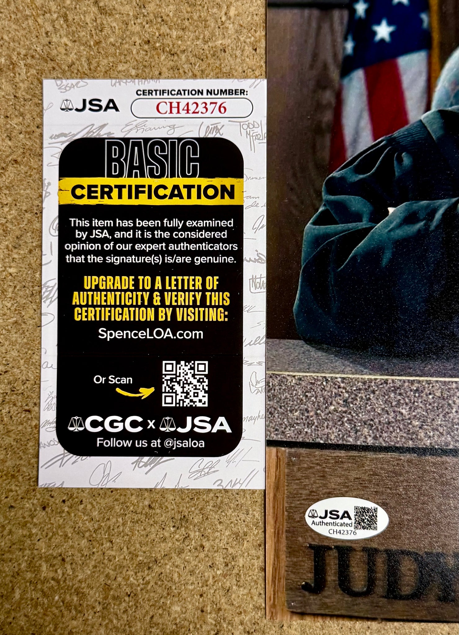 This 8x10 photo of Judith Sheindlin, famously known as Judge Judy, is a rare find for any television memorabilia collector. The photo is signed by Judge Judy herself and comes with a Certificate of Authenticity from James Spence Authentication (JSA). This original piece makes for a great addition to any collection and is perfect for fans of Judy Justice, the newest show featuring the iconic judge. Don't miss out on this opportunity to own a piece of television history.
