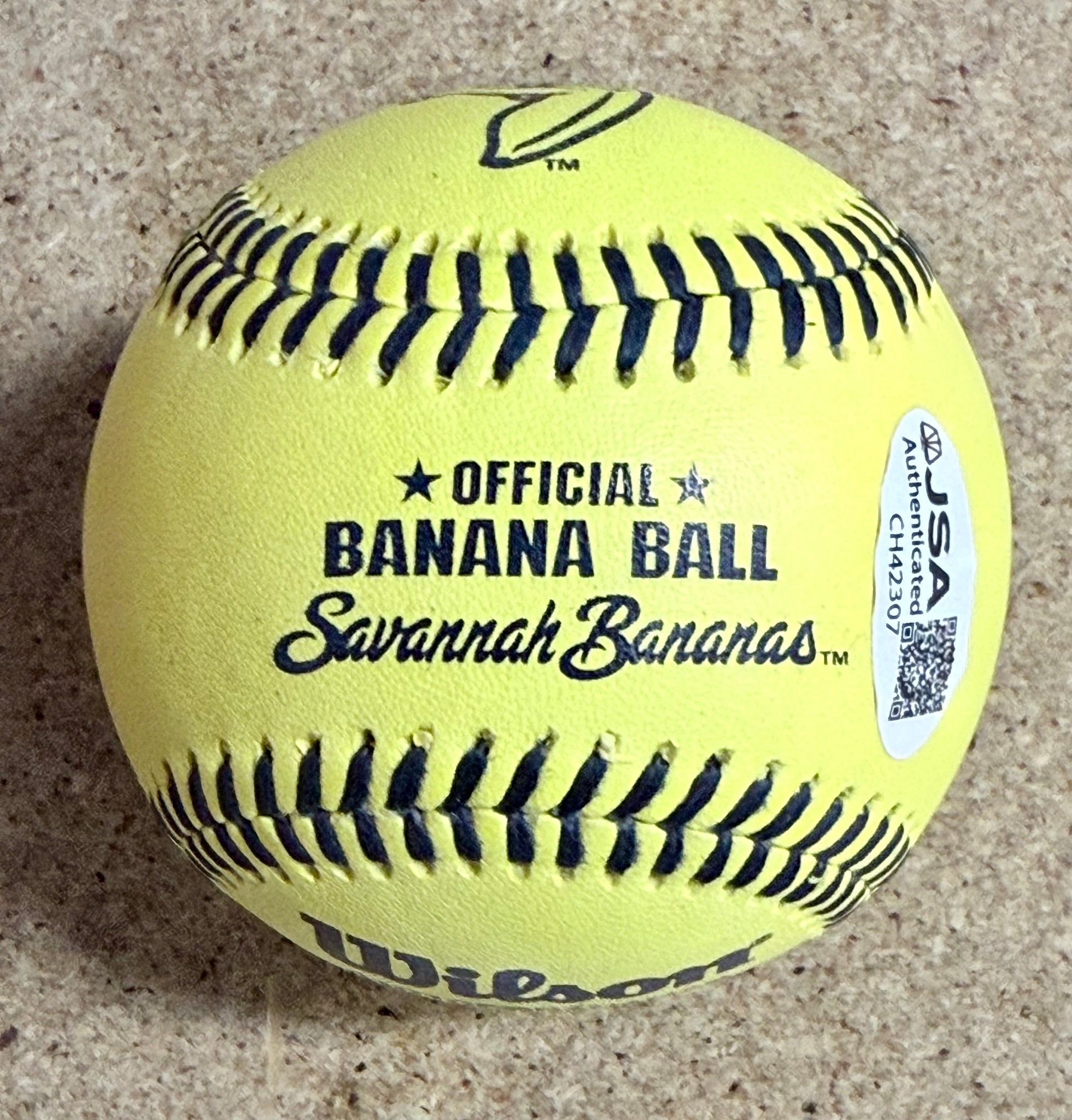 The autograph is authenticated by James Spence Authentication (JSA), ensuring its authenticity. This unique item is a collectible piece for fans of the Savannah Bananas and Jesse Cole, making it a special addition to any sports memorabilia collection.