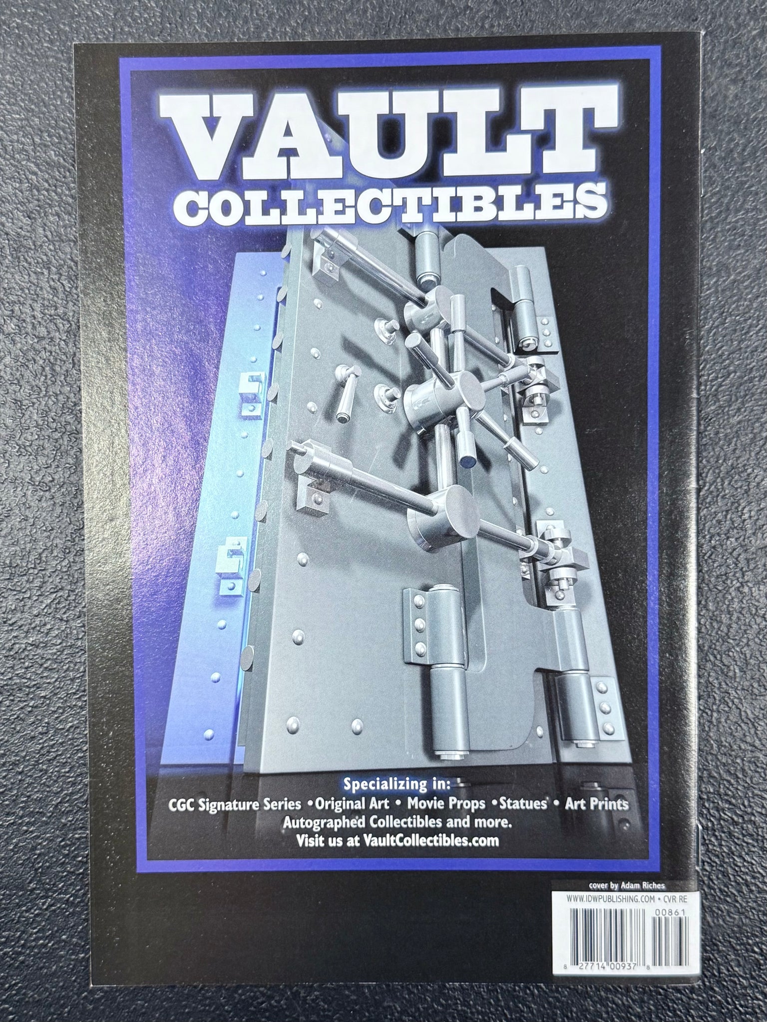 The product is a single issue comic book titled Back to the Future #8, part of the IDW Publishing universe. This particular variant is a Retailer Exclusive with a Vault Collectibles Exclusive Connecting Cover, featuring characters such as Doc Brown and Marty McFly. The comic is in English, colored, and falls under the genres of action, adventure, and science fiction. Signed by artist Adam Riches, this modern age comic from 2016 is a must-have for fans of the Back to the Future series and collectors of exclusive comic book variants.