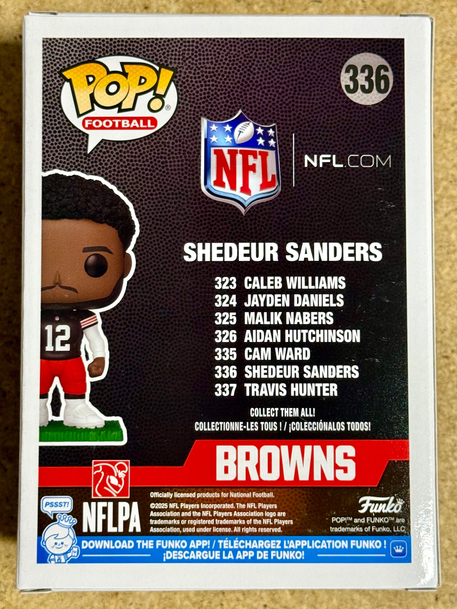 This listing is for Funko Pop! Football Shedeur Sanders #336, featuring the NFL Cleveland Browns quarterback and one of football’s most exciting young players. Part of Funko’s 2026 Football lineup, this Pop! highlights Sanders early in his professional career and is a great collectible for fans and investors alike.