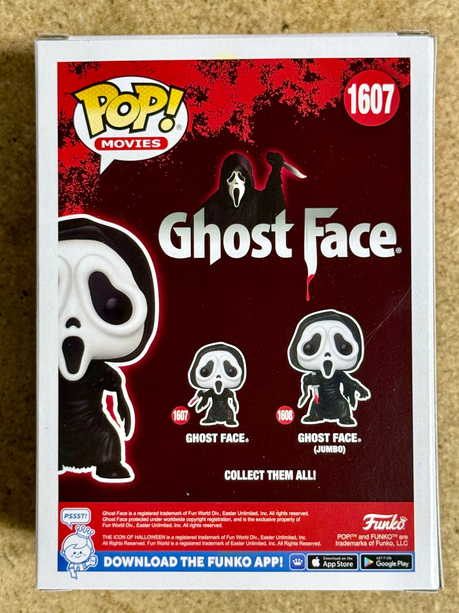 The Funko Pop! Movies Ghost Face With Bloody Knife #1607 is a vinyl figure featuring the character Ghostface from the Scream franchise. This collectible item is part of the Pop! product line by Funko and is packaged in its original, unopened packaging.