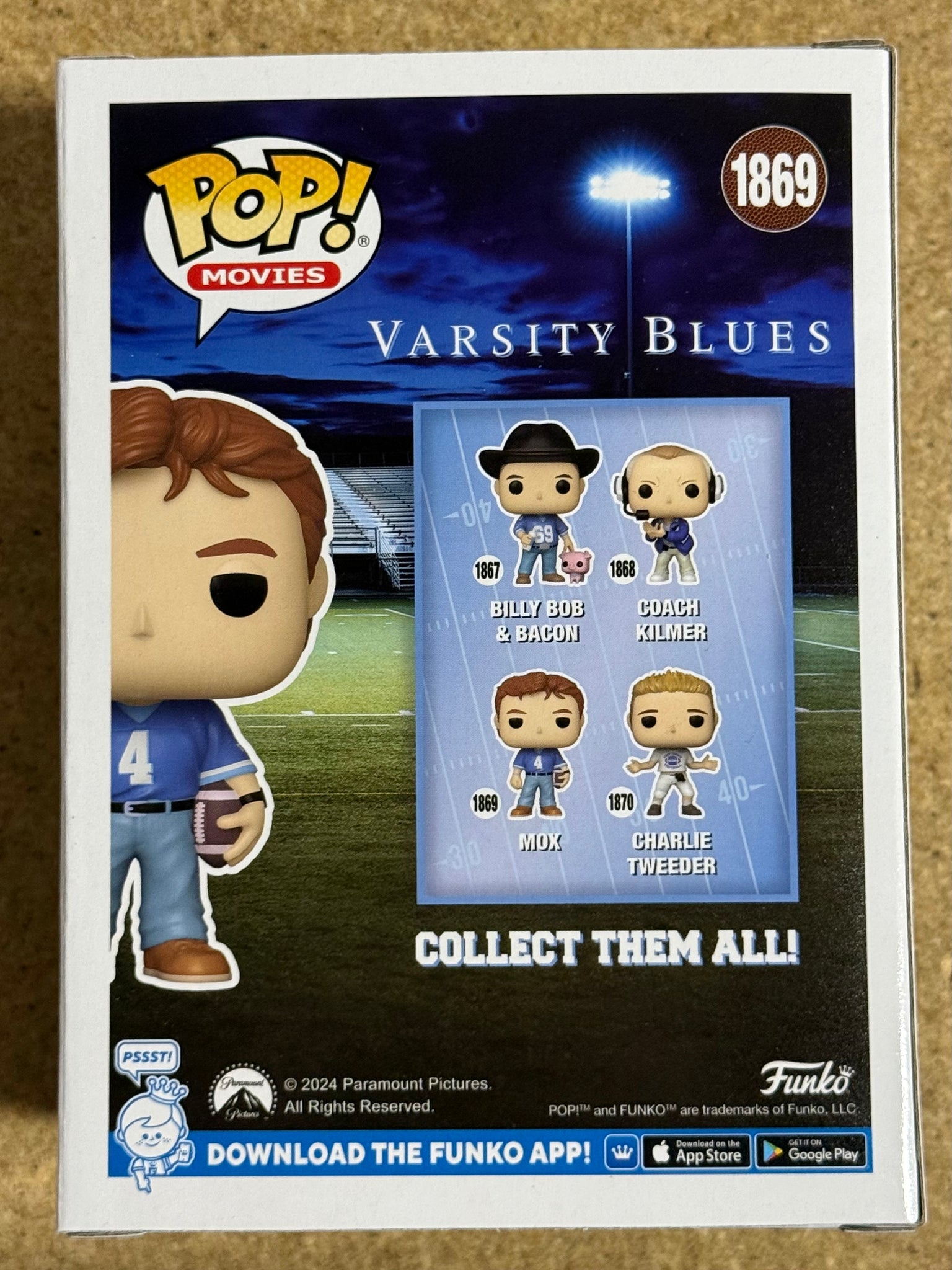 This listing is for Funko Pop! Movies Mox #1869 from Varsity Blues (2024 release), featuring Jonathan “Mox” Moxon, the star quarterback portrayed by James Van Der Beek in the cult-favorite football film.