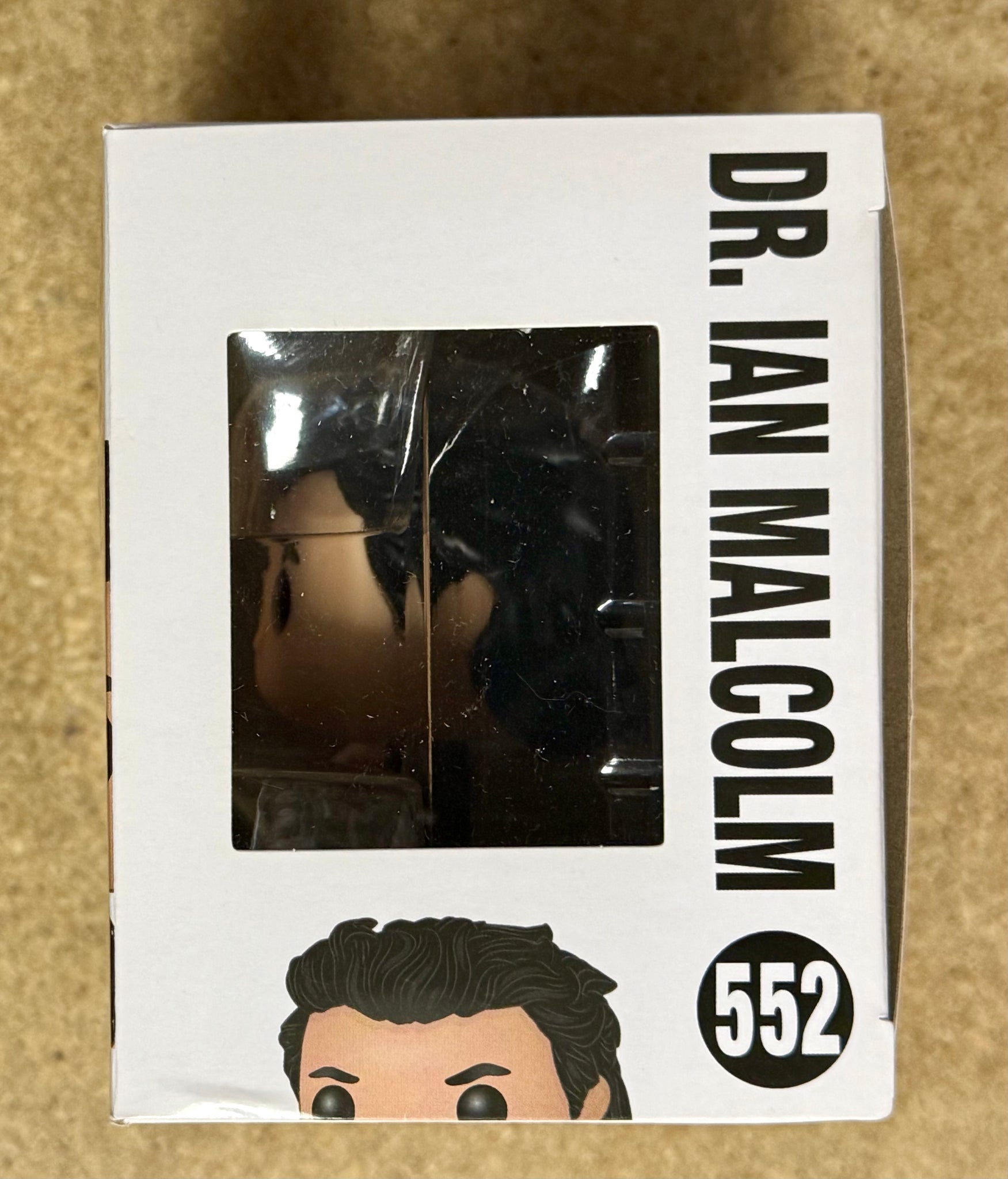 This listing is for a Jeff Goldblum Signed Wounded Ian Malcolm Funko Pop! #552 from Jurassic Park, authenticated by James Spence Authentication.