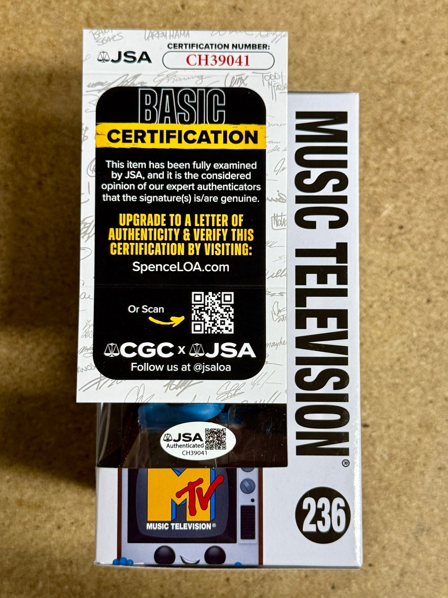 The product is a 2024 MTV Funko Pop #236 signed by musician Brent Smith of Shinedown. This vinyl figure from the Pop! collection features the character of Music Television and comes with a James Spence Authentication (JSA) COA.