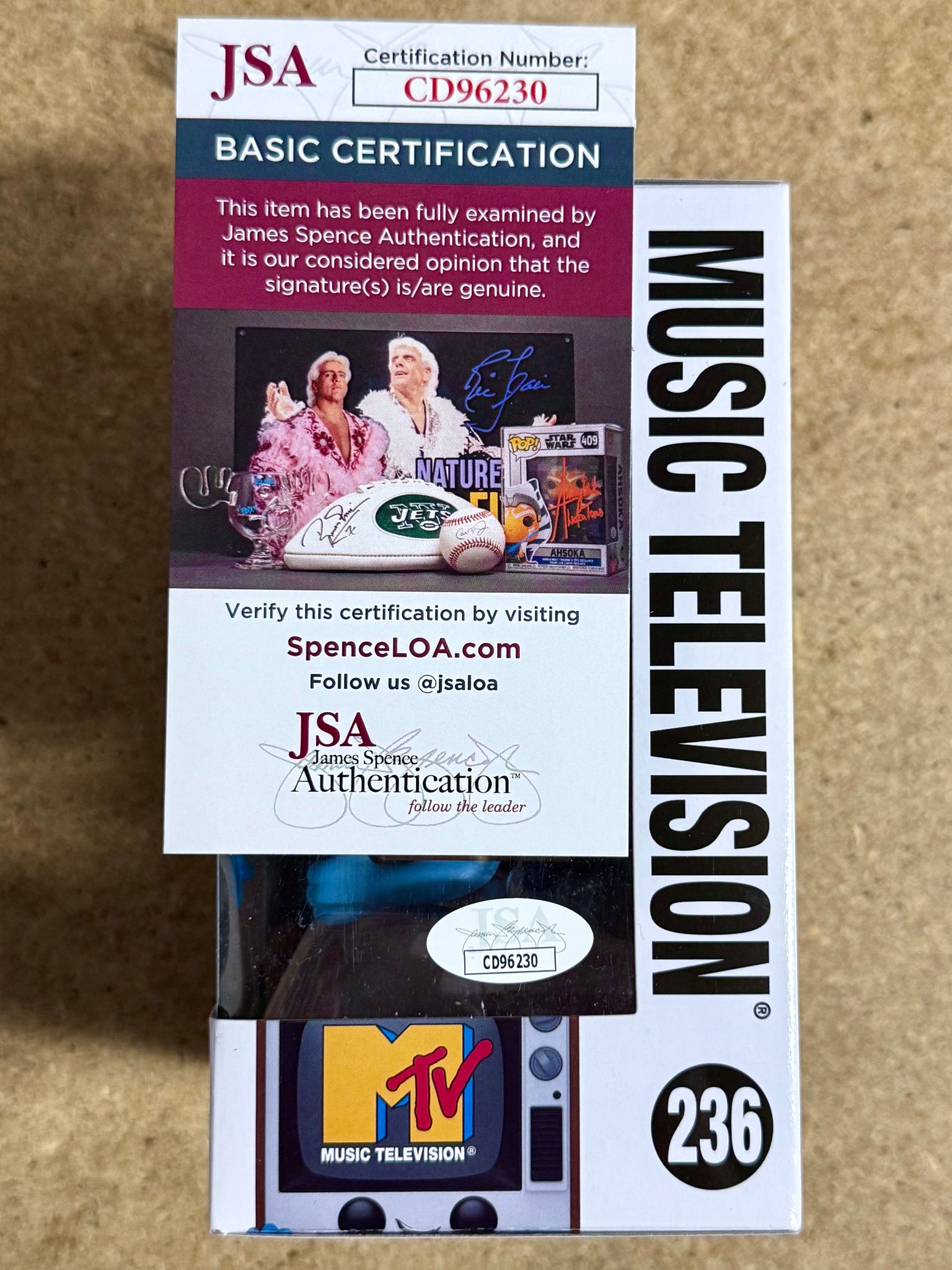 The product is a signed 2024 MTV Funko Pop #236 featuring Music Television's iconic character, Donny Osmond. Authenticated by James Spence Authentication (JSA), this vinyl figure is part of the Pop! collection and comes in its original packaging with a protector.