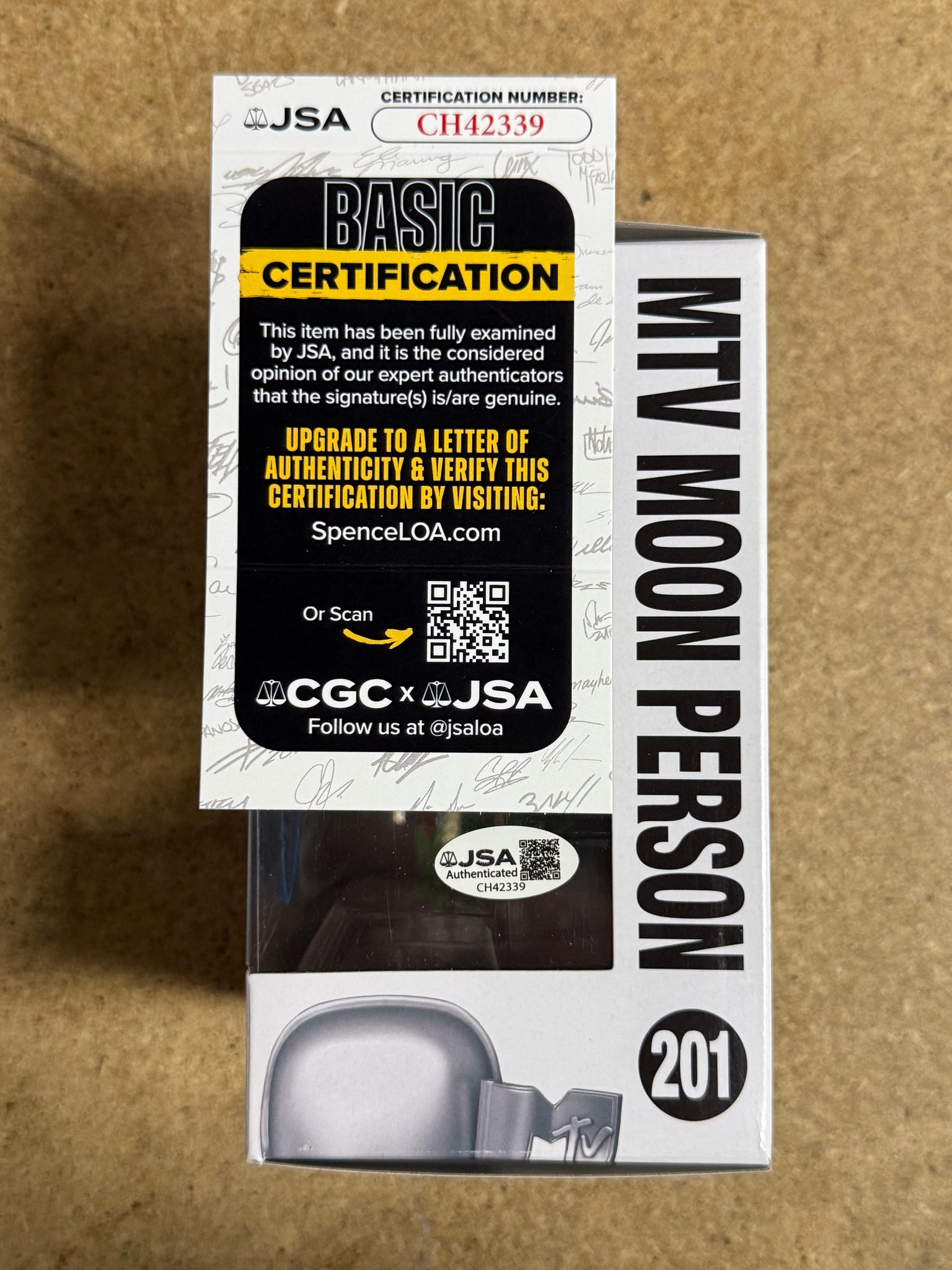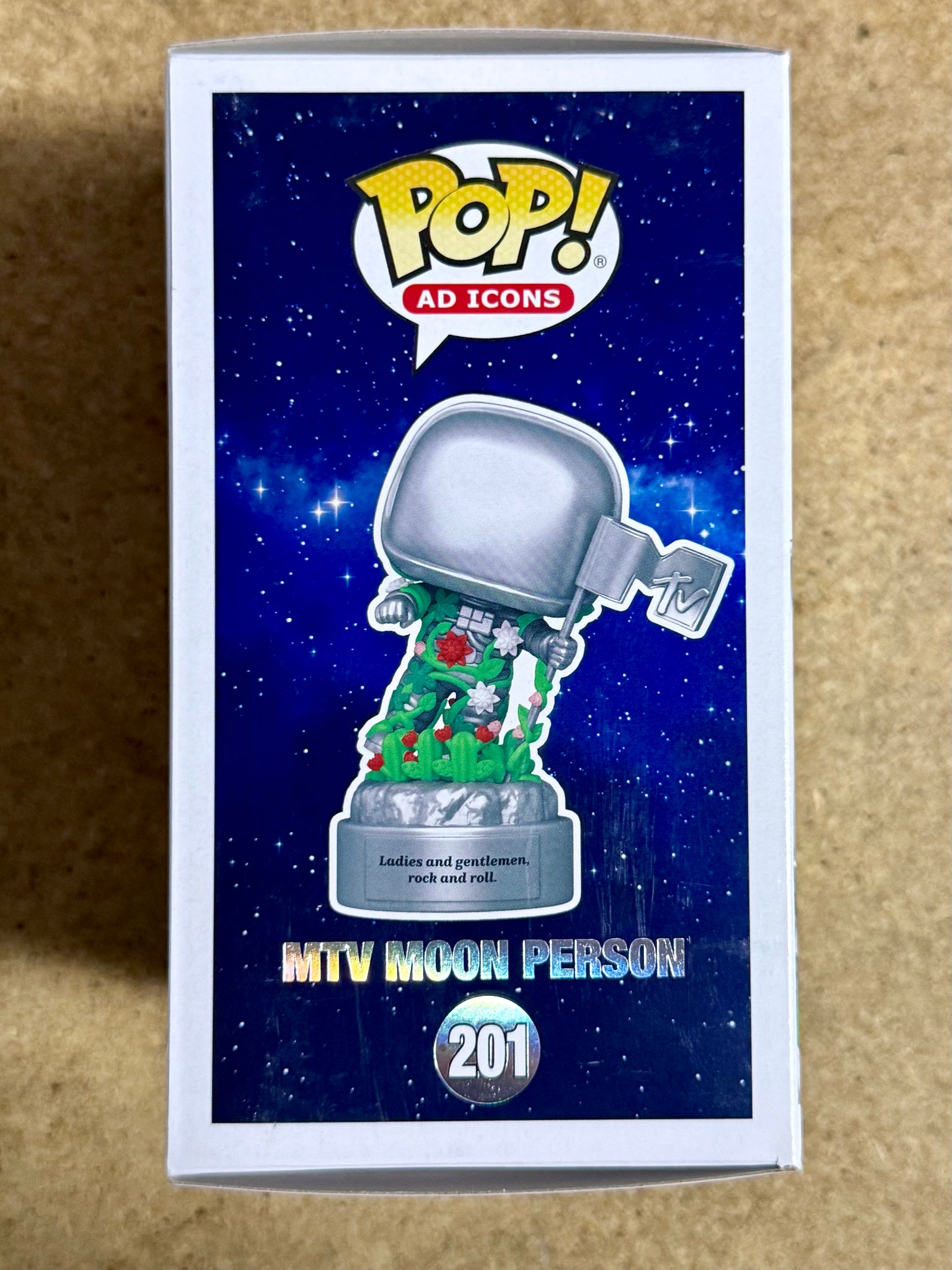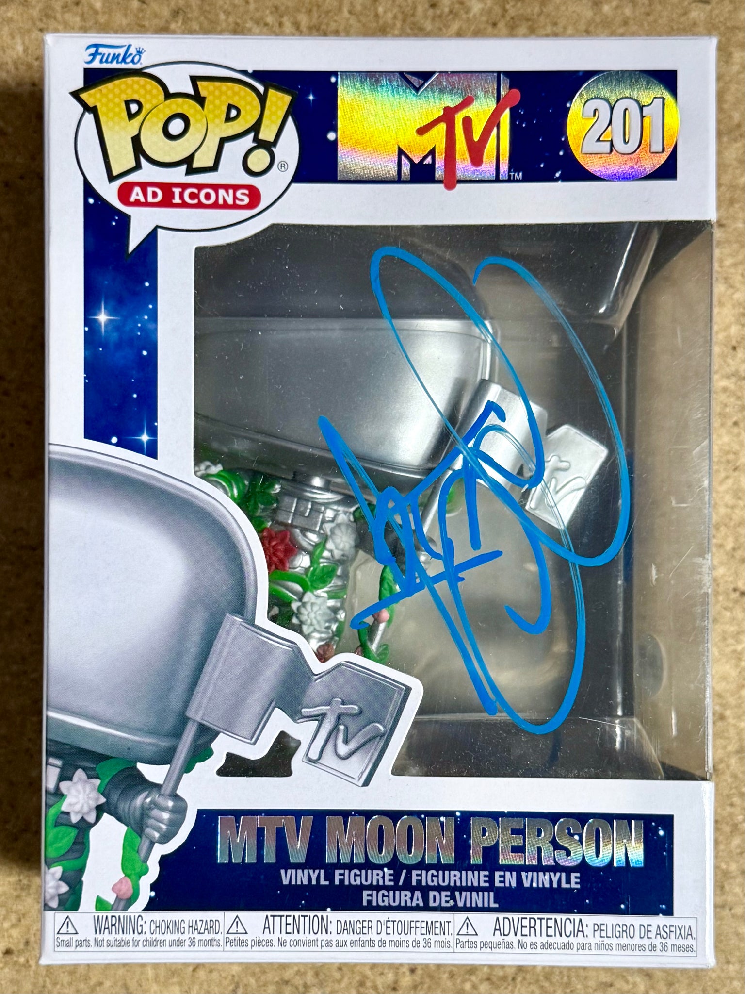The product is a Tyson Ritter signed Funko Pop! vinyl figure of the MTV Moon Man character. It is from the Rocks collection and features an autograph authentication by James Spence Authentication (JSA).