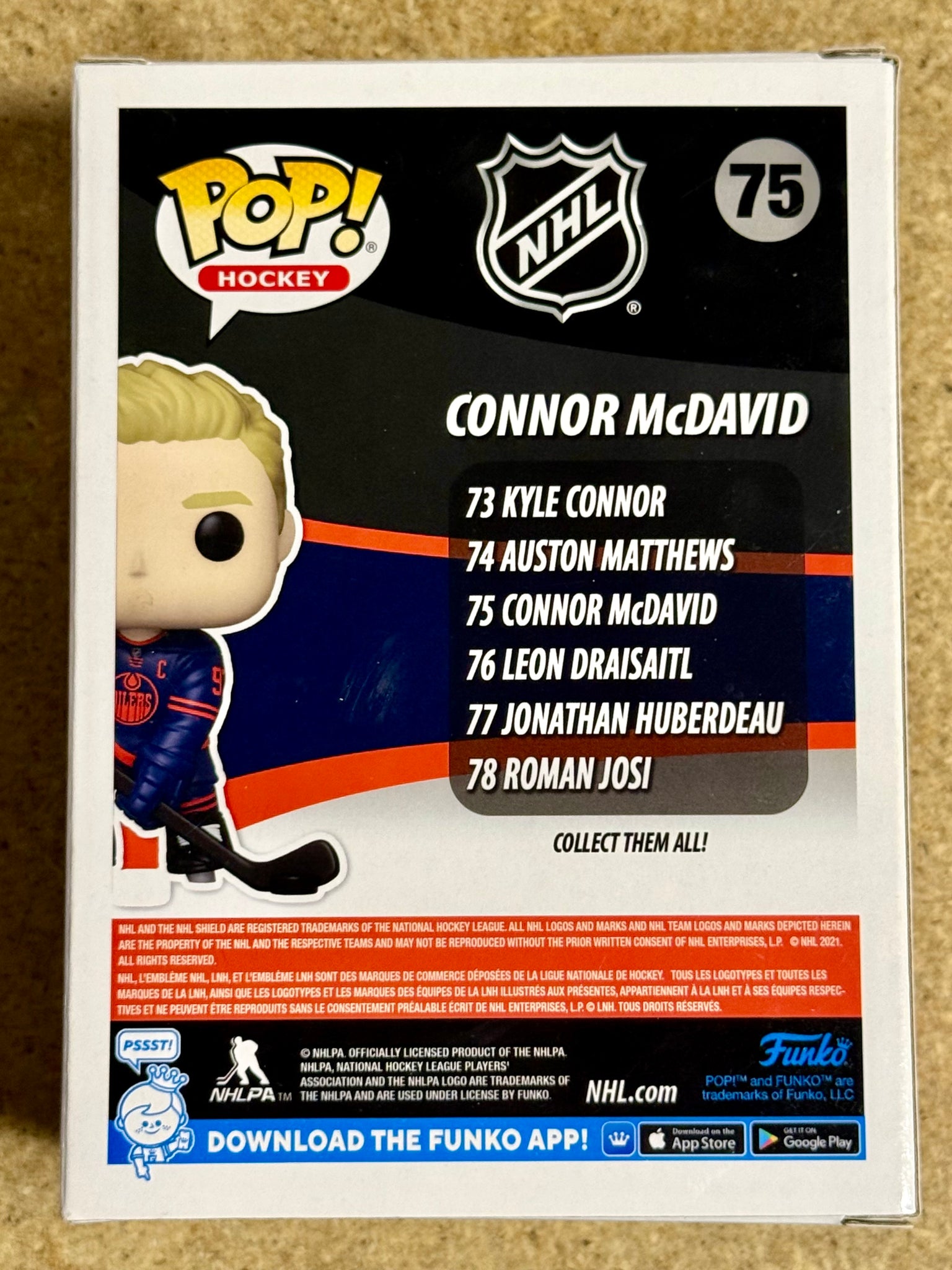 This Funko Pop! NHL #75 features Connor McDavid of the Edmonton Oilers (2021) and has been hand signed by McDavid, one of the most dominant and celebrated players of his generation. The autograph is bold and well placed, making this a standout piece for any hockey memorabilia or Funko Pop collection.