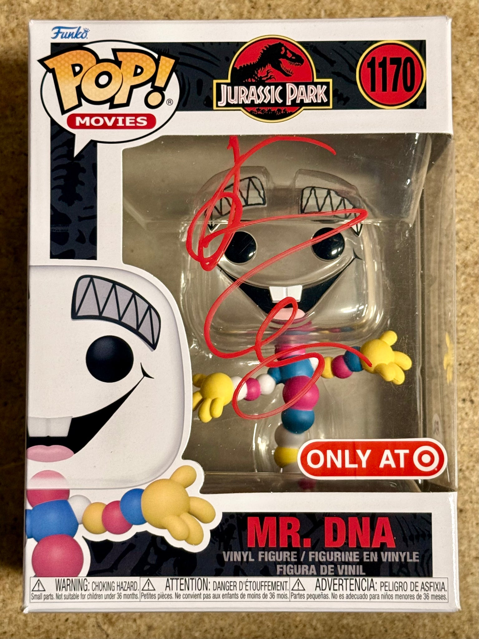 This Funko Pop! Exclusive #1170 features Mr. DNA from the classic film Jurassic Park and has been hand signed by Jeff Goldblum, who portrayed Dr. Ian Malcolm in the iconic franchise. The signature is bold and well placed, making this a unique and eye-catching addition to any Funko Pop or movie memorabilia collection.