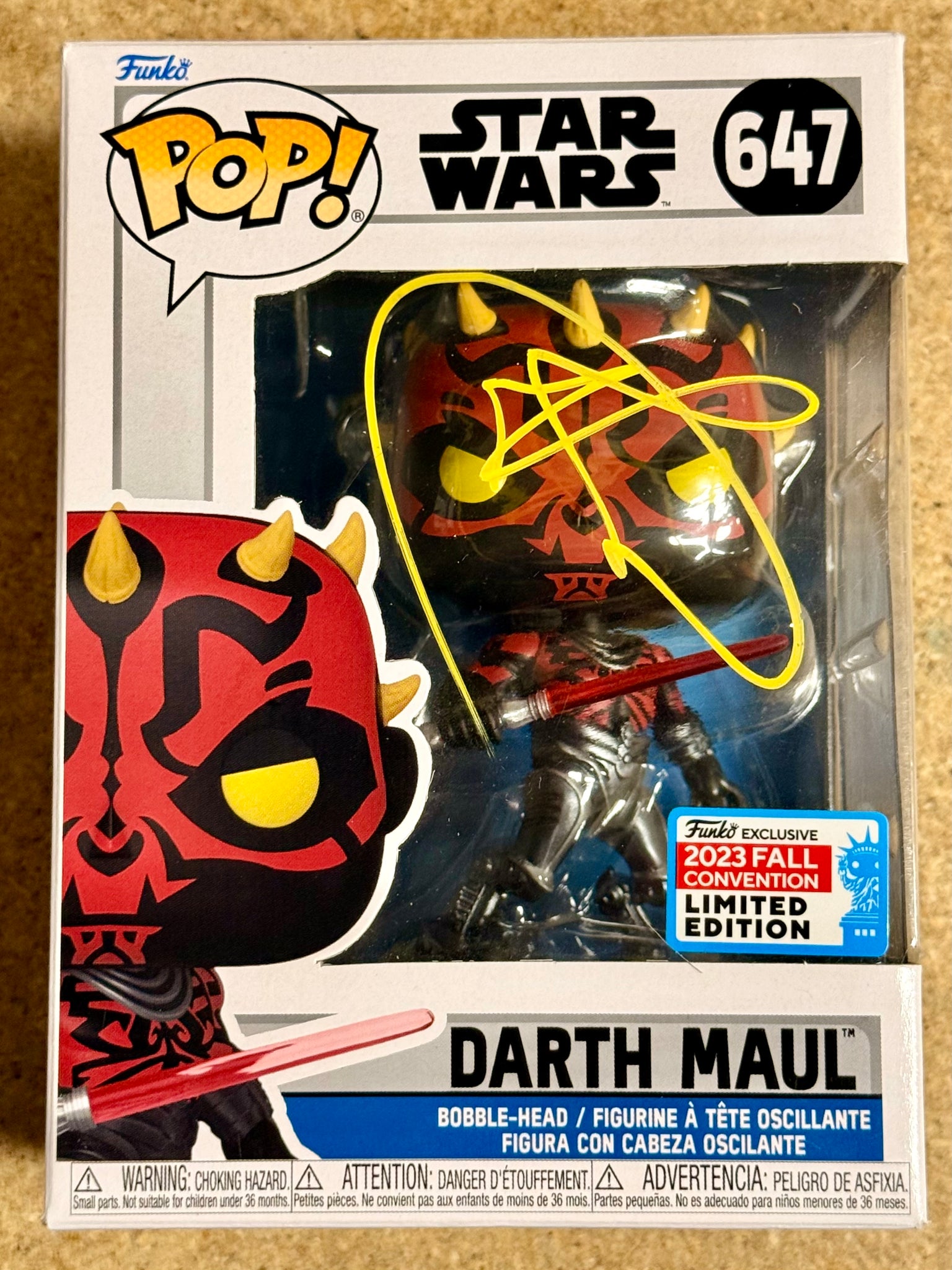 This Funko Pop! #647 features Darth Maul from Star Wars and is a New York Comic Con (NYCC) Exclusive, making it a highly desirable collectible. The figure has been hand signed by Ray Park, who famously portrayed Darth Maul in Star Wars: Episode I – The Phantom Menace. The autograph is bold and well placed, creating an eye-catching display piece for any Star Wars or Funko Pop collection.